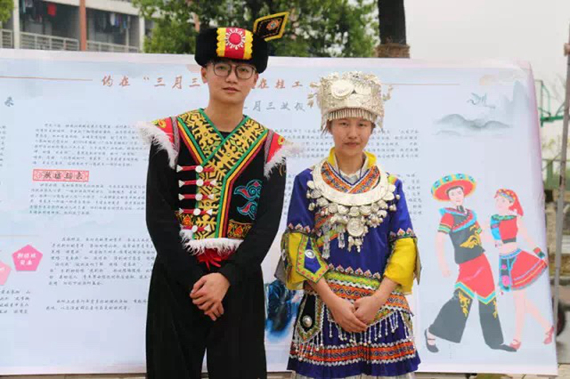 “三月三”是壮族人民的传统节日,壮族人称“窝埠坡”或“窝坡”,原意为到垌外、田间去唱歌,所以也称“歌圩节”。活动现场,同学们通过展示民族特色服饰吸引师生围观,进而结合展板讲解“三月三”的由来和介绍抛绣球、对歌、做五色糯饭、染彩色蛋等节日习俗。在互动环节,主要以民族美食、民族习俗以及民族歌曲来引导大家多方面了解壮乡文化,娱乐中学习提高。针对大部分同学们关于为何广西有“三月三”假期的疑问,活动中从国家法规和人民愿望两方面为大家进行解答。