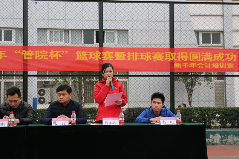 开幕式上,首先由裁判协会负责人韦唯代表裁判进行庄严宣誓,他表示本次赛事将遵循着公平、公正、公开的原则,竭力为运动员们创造一个公平、良好的比赛环境。接着,管理学院篮球队队长周作彬代表参赛运动员们进行宣誓。他强调本次比赛是管理学院学子展示自我风采与体育素质的平台,运动员应本着“友谊第一,比赛第二”的态度去认真对待每一次比赛。 随后,管理学院团委副书记曾丽萍讲话,她指出举办本次“管理杯”球赛旨在于全面贯彻党的教育方针,激发同学们的体育锻炼热情,希望同学们在比赛中积极拼搏,赛出风格,赛出水平,相互交流,共同进步。
