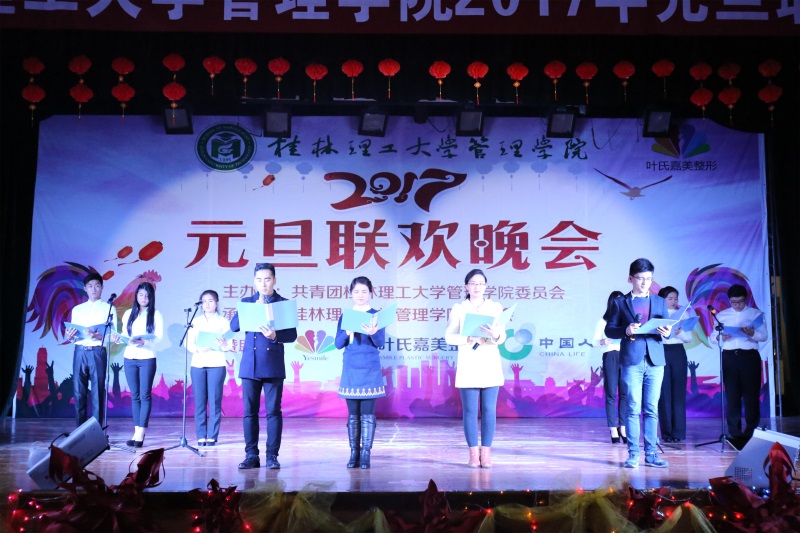 晚会上,南礼堂张灯结彩,观众们欢聚一堂,处处都是新年的欢乐气息。晚会伊始,管理学院党委书记周章明老师为晚会开幕致辞。周书记在致辞中回顾了管理学院2016年在教学科研、学科建设、专业学科竞赛、文体活动等方面取得的累累硕果,同时代表管理学院党委行政对一年来为学院发展建设默默奉献的全体师生表达感谢,最后周书记表达了希望管理学院全体师生在新的一年中同心同德、奋发图强,为学院各项发展建设再创佳绩的美好期待。