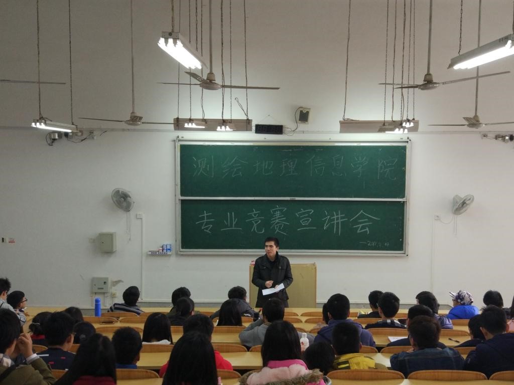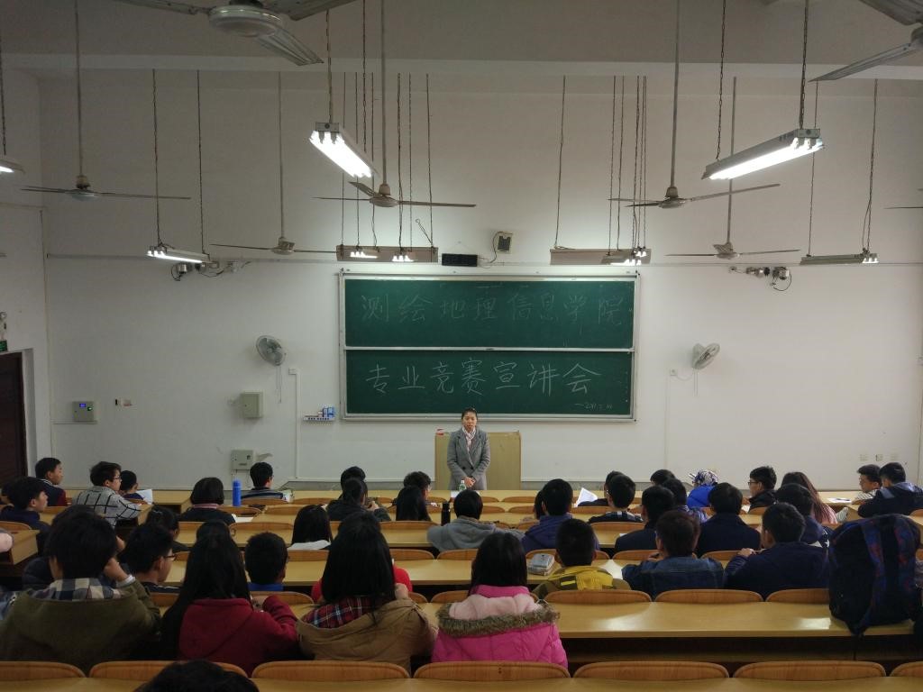 会上,殷敏老师首先向同学们详细地介绍四个关于大学生科技竞赛的项目:2017Esri杯中国大学生GIS软件开发竞赛、全国高校GIS技能大赛、Super Map杯第十五届全国高校GIS大赛、全国GIS应用技能大赛。殷敏老师结合自身的大赛指导经验,向同学们介绍了各类比赛的备赛技巧和方法,她希望同学们能“以赛促学”,掌握更多的专业技能。随后,夏勇超老师对参赛同学进行了动员,他鼓励同学们积极参与专业学科竞赛,在竞赛中提升专业水平,为今后的个人发展奠定良好的基础。