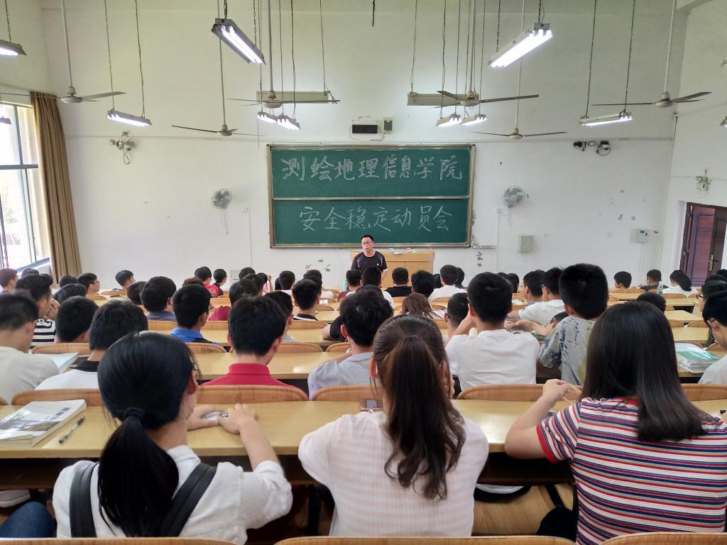 5月26日中午,测绘地理信息学院于雁山校区04111教室顺利召开安全稳定动员大会。院党委副书记张海东老师,团委副书记夏勇超老师,辅导员刘茜雯老师、刘砥老师、徐丹老师,以及大一至大四各级生活委员、宿舍长参加会议。