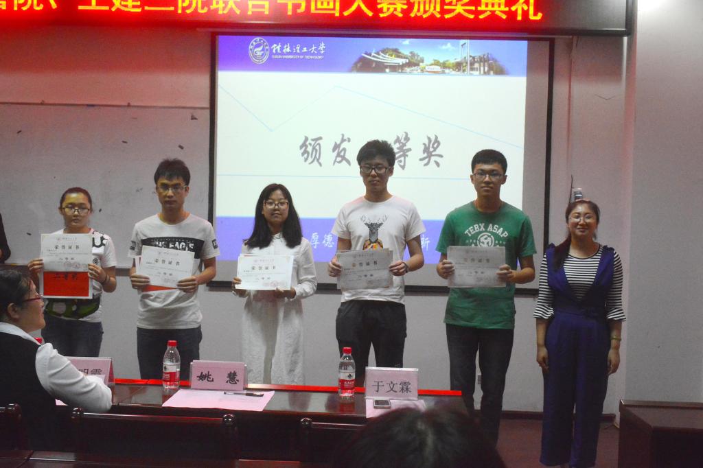 晚会伊始,主持人播放了60余幅优秀作品的集锦。入木三分的书法,书写桂工;惟妙惟肖的绘画,画出梦想。紧接着是颁奖环节,土建学院石桂娟同学的书法作品《遇见桂工》和材料学院徐祖盛同学的书法作品《桂工风采》斩获一等奖。韦宏帆、叶嘉玲、唐键斌、覃鹏建、黄素雅同学的作品荣获二等奖。刘玉萍等同学的作品获得三等奖。之后的有奖问答小游戏使晚会气氛更加轻松活跃。最后,晚会在姚慧老师“将艺术融于生活,把生活当做艺术”的致辞中圆满落幕。