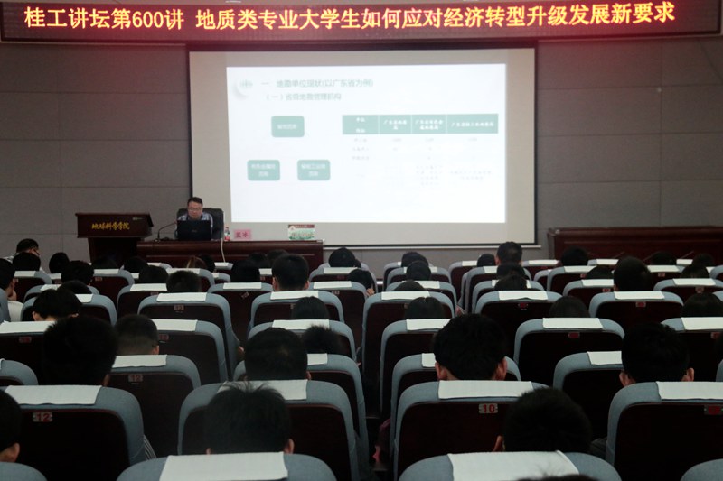 4月20日10:30,,学校92级校友,广东省有色矿山地质灾害防治中心蓝冰主任应邀于雁山校区逸夫楼501学术报告厅进行以“地质类专业大学生如何应对经济转型升级发展新要求”为主题的讲座。地学院院党委副书记耿俊茂相关专业师生到场聆听讲座,党委副书记耿俊茂主持本场讲座。