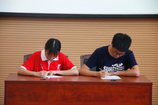 仪式第五项,暑期留校学生代表以及“三下乡”社会实践团成员代表上台签订安全承诺书。