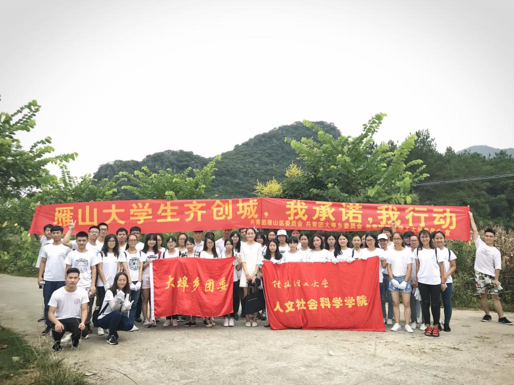 为响应参与桂林市创建全国文明城市工作,2017年9月7日,我校人文社会科学学院学生志愿者在大埠乡团委指导下,深入雁山区大埠乡进行道路清理工作。