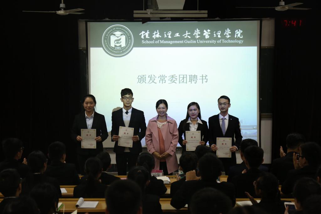会议从观看换届视频中拉开帷幕。随即商学院原常委团邹敏辉、兰小欢、张涛以及何邓睿发言,他们总结了自己在团委学生会中的工作经验,同时希望下一届学生干部能够充分发挥模范带头作用,严格要求,以身作则。成员之间团结协作,密切配合,将学院的学生工作推向更高水平。随后,曾丽萍与白宇航两位老师为常委团、各部门部长、各部门副部长以及2016级各部门干事颁发了聘书。接着,新一届常委团代表,团委副书记梁秋宁、学生会副主席陈星河上台发言。他们发言中表示十分感谢老一辈成员在过去的一年中辛苦付出,为学院所作出的累累贡献,同时也希望今后的学生干部队伍能够以内部建设为中心,找准定位,勇立潮头,同时注重塑造自身形象,树立学院品牌。