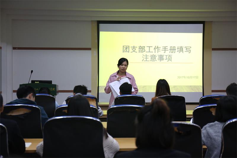 为了加固各班团支书对团支部工作的认识,让各班团支书能够更好的开展班级活动,商学院于 10月17日下午三时在屏风校区7309报告厅召开团支部工作手册填写注意事项会议。管理学院团委副书记曾丽萍出席参加会议,2015、2016级各班级团支书共33人参加了本次会议。