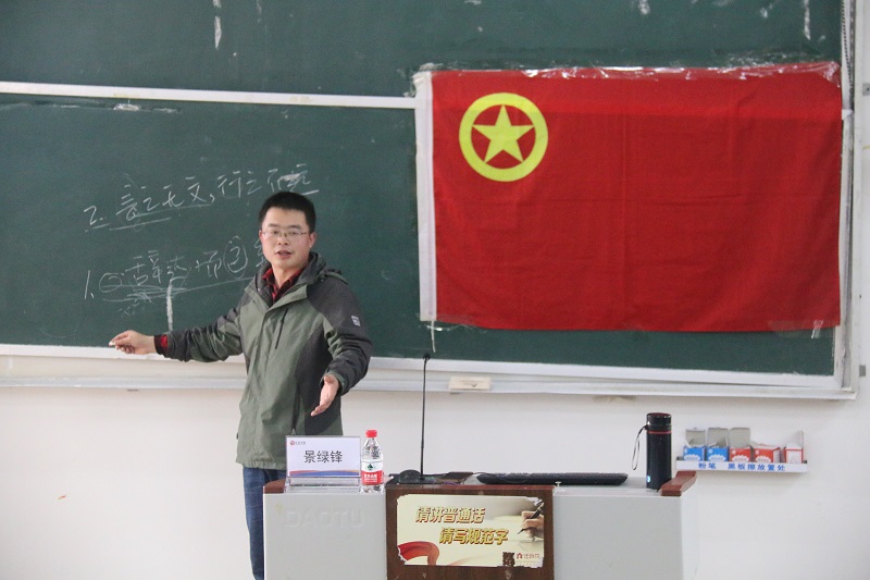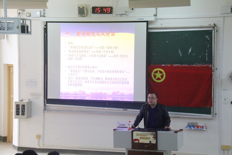 首先,景绿锋老师以读书一话题为同学们引出了此次培训的主题主旨,并通过列举不同例子,鼓励同学们在生活中发现美和新闻,热爱拍照,热爱写作。随后,王英强老师为现场同学进行了校园新闻稿写作培训:他先分析了新闻定义及特性,强调了新闻的时效性和真实性;而后详细介绍了新闻六大要素、新闻的分类与新闻写作的基本要求等,希望同学们提升对新闻的敏感度,并指出了新闻写作中的一些禁忌和同学们撰写新闻稿时易犯的错误。接着,王老师结合自身丰富的摄影经验,通过展示前期精心准备的照片为现场同学介绍了拍照的方法与技巧,给予现场同学许多关于照片美感的建议。最后,王、景二位老师与台下同学进行了热烈的交流互动,其专业的回答获了现场同学的阵阵掌声。