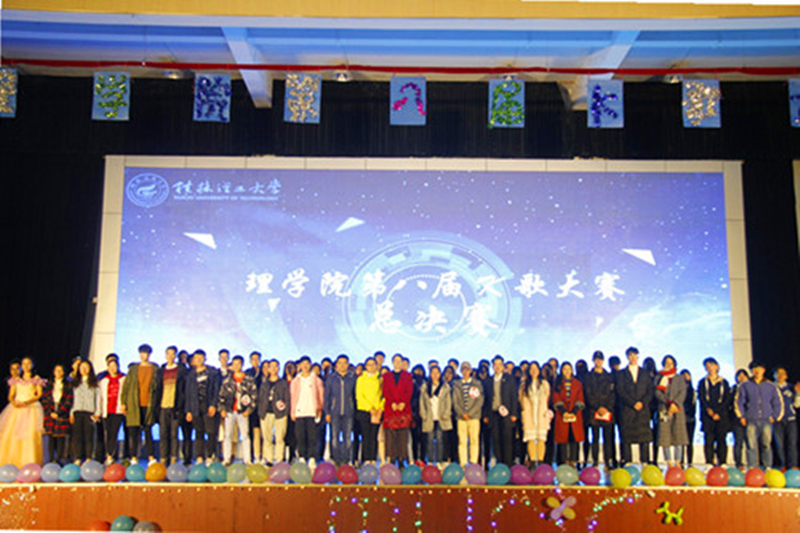 为丰富理学院师生的校园文化生活,激发广大学生热爱艺术、勤奋学习、努力成才的热情与动力,不断提高自身素质,推动校园精神文明建设,12月8日19:00理学院于雁山校区体育训练馆顺利举办主题为“青春礼赞十九大,唱响桂工梦飞扬”的校园K歌大赛决赛。理学院党委副书记孙巍老师、17级辅导员李鹏宇老师、15级辅导员李敏老师、学院学生会主席团出席了此次活动。同时邀请到音乐协会会长、星空乐队主唱、304乐队主唱、合唱团团长、阿卡贝拉队队长、校学生会文艺部部长、理学院上届文艺部部长担任此次比赛评委,各学院文艺部部长、理学院全体学生会成员、理学院全体同学参加了本次活动。