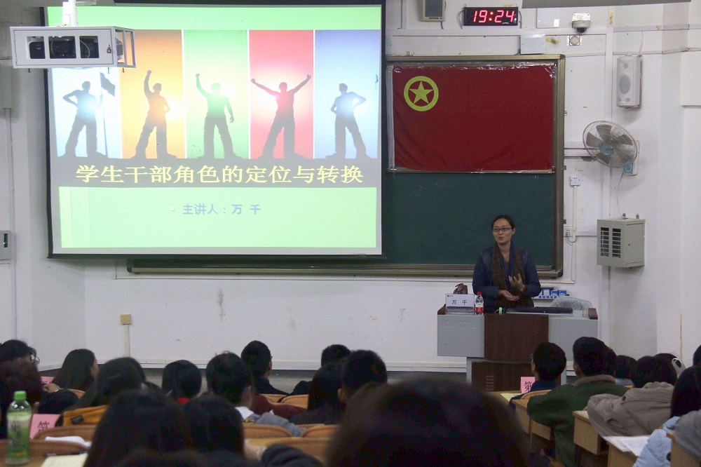 为促进我院学生干部对自身角色的认识、增强业务能力。12月12日晚,我院党委副书记万千应邀在雁山校区惟实楼05101教室进行题为“学生干部角色的定位与转换”的团校培训,学院各学生组织成员参加了此次培训。