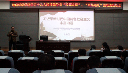 结合《beats365亚洲版关于学习宣传贯彻党的十九大精神辅导员“校园宣讲”和“网络巡礼”活动方案》的相关部署,为让辅导员和青年学生学在一起,讲在一起,悟在一起,12月19日19:30,地球科学学院于雁山校区01501报告厅展开学习十九大精神辅导员“校园宣讲”、“网络巡礼”活动启动仪式,并由学院党委副书记耿俊茂进行第一讲。