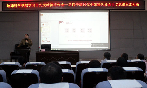 随后,耿书记为大家做题为《习近平新时代中国特色社会主义思想丰富内涵》的十九大精神学习报告会。现场首先通过十九大会后的采访视频,使同学们更全面地了解十九大的内容、内涵。接着,耿书记从“八个明确”、“十四个坚持”具体阐述习近平新时代中国特色社会主义思想丰富内涵。耿书记还联系学院这几年的发展历程以及个人的经历,向同学们阐述了自身对于十九大精神的理解,即“不忘初心,不懈奋斗,自信自强”。在会议最后,耿书记语重心长地对在座学子说:“希望同学们都努力学习,和地院一起,奋发图强,敢于拼搏,勇于创新,为新时代中国特色社会主义道路,奉献自己的一份力量!”。报告会赢得在场学子们热烈掌声。