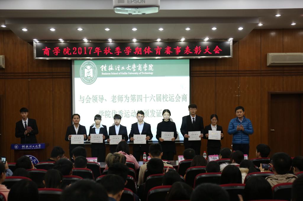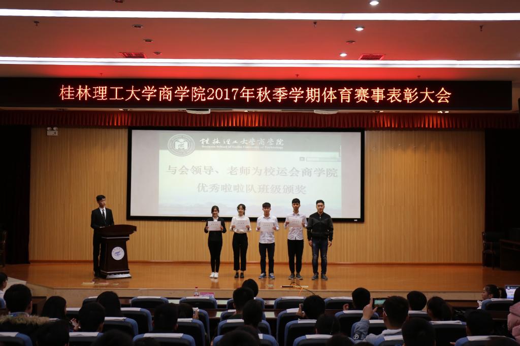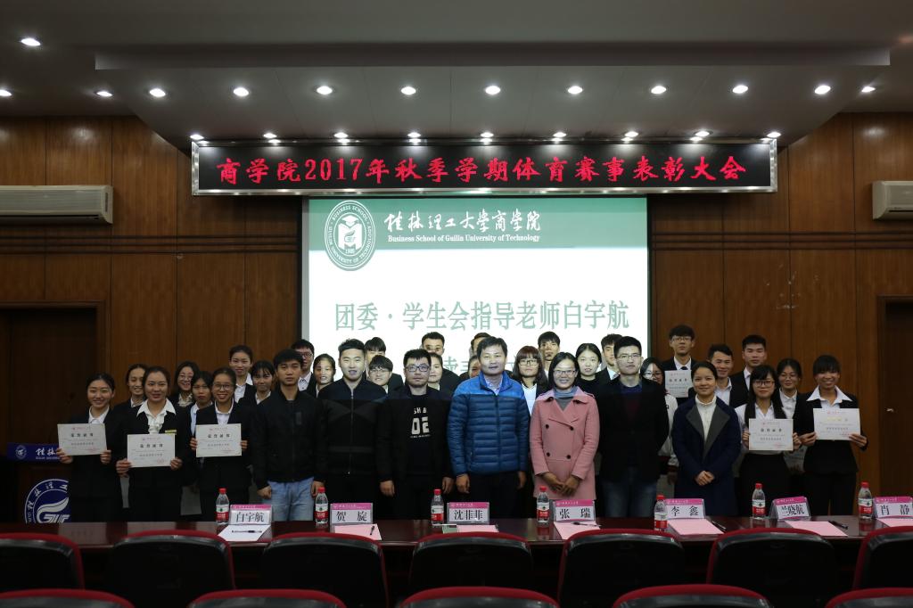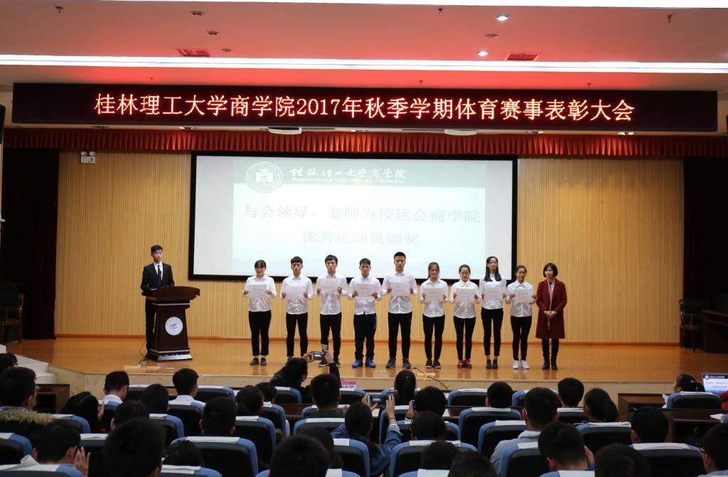 为激励商学院广大同学积极参加体育赛事,营造学院良好的运动氛围,带动同学们积极参与体育活动,锻炼身体。商学院于12月9日和12月19日分别在屏风校区9501教室和雁山校区图书馆报告厅举行商学院2017年秋季学期体育赛事表彰大会。商学院党委副书记张瑞、学工组长沈菲菲、全体辅导员出席表彰大会。获奖个人与学院15、16、17各班班长、体育委员参加了表彰大会,大会由体育部副部长裴祺阳主持。