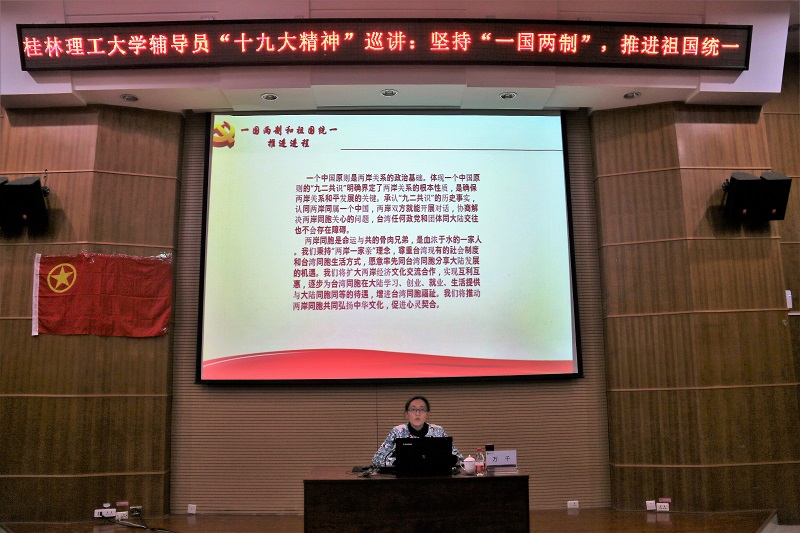 活动伊始,万千老师以一首新华社神曲《一国两制》引出主讲题目。随后,她带领同学们一起回顾了中国近代史上受人侵略的惨痛教训,分析了祖国统一问题的由来,强调一个中国原则不可破坏。接着,万千老师详细讲述了“一国两制”科学构想的形成过程,展示了香港和澳门在回归后取得的举世瞩目的成绩,肯定了“一国两制”科学构想的成功实践。最后,万千老师引用十九大新晋“网红”卢丽安的话语“没有融入中国梦的台湾梦是黄粱一梦”告诫在座的同学,没有融入中国梦的青年梦也是黄粱一梦。她希望大家修身立德,立志成才,为实现祖国统一、繁荣昌盛贡献出青年学子的力量。