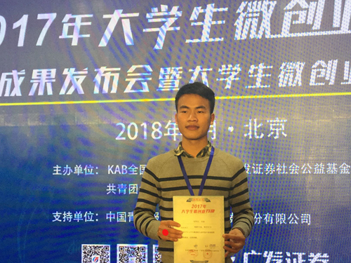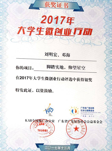 日前,由KAB全国推广办公室、广发证券社会公益基金会、共青团北京邮电大学委员会主办,广发证券股份有限公司、中国青年报社提供支持的2017年大学生微创业行动成果发布会暨大学生微创业论坛在京举办。地球科学学院勘技15-1班学生刘明宏报送的《脚踏实地,仰望星空》项目荣获银奖,获得微创业扶持资金两万元。