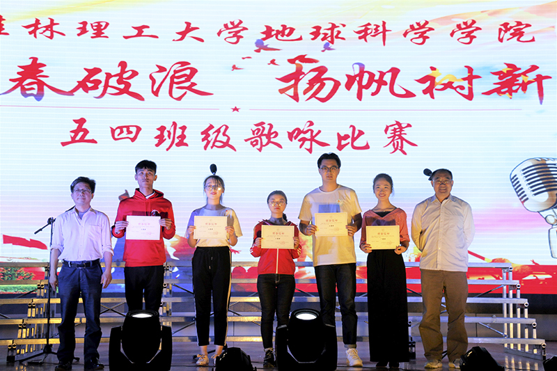 为加强爱国主义教育,弘扬 “五四”精神,唱响青春爱国主旋律,4月24日晚,地球科学学院在雁山校区体育馆举行主题为“青春破浪,扬帆树新”五四歌咏比赛。学院党委书记姜子亮、教育部工程中心主任陈远荣和学院党委副书记耿俊茂受邀出席,各班班主任和各年级辅导员参加。