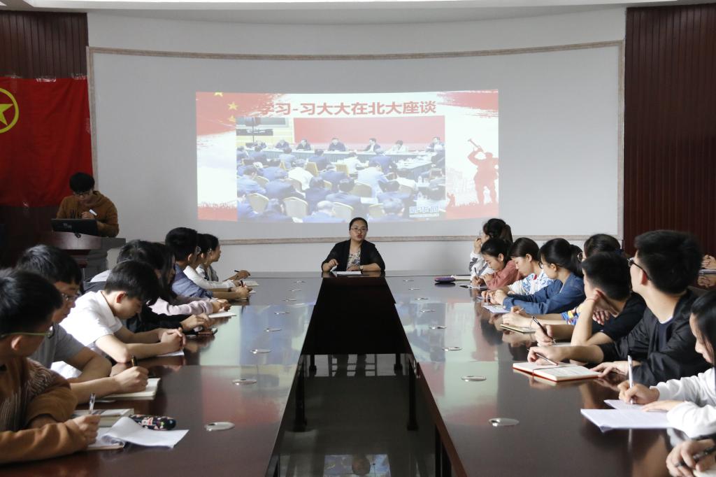 5月4日,化生学院在12217会议室召开了学习习近平总书记北大师生座谈会重要讲话精神的会议。本次会议由化生学院团委书记饶筠筠老师主持,化生学院青年教师代表、化生学院团委主要学生干部以及各团支部书记参加本次学习。