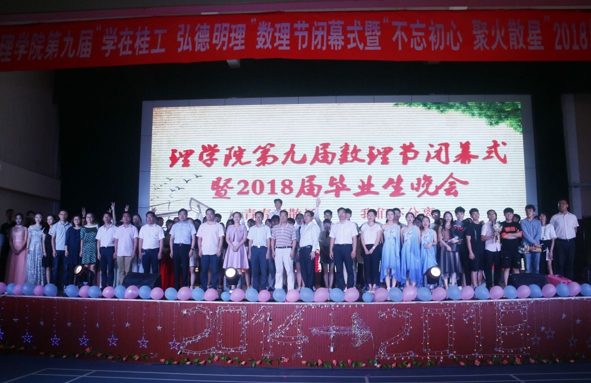 理学院一年一度的校园文化盛宴——数理节闭幕式暨毕业生晚会于2018年6月2日19:30在雁山校区体育馆隆重举行。校工会常务副主席辛立章、理学院党委书记陆平、理学院院长肖剑荣、beats365亚洲版副书记潘思伊、理学院副院长唐国强、张富文、蒋远营,理学院党委副书记孙巍、学工处学生管理科科长罗义淞、院长助理李明、物理教研室主任夏雄平、物理实验室主任马家峰出席晚会现场,各学院辅导员代表、理学院全体辅导员、各班班主任、部分教研室老师与理学院全体本科生和研究生参加了本次晚会。