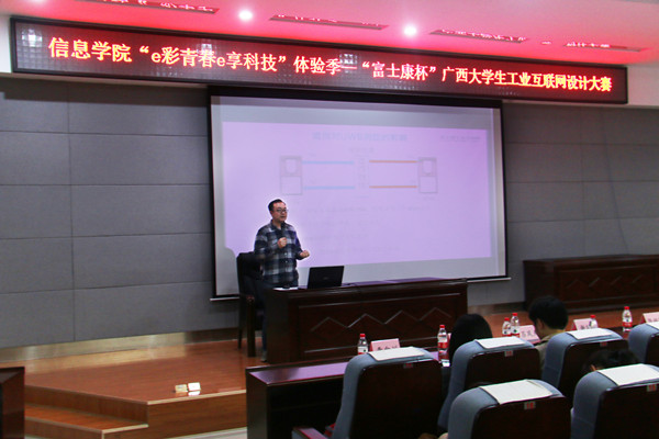 开幕式上,先由信息科学与工程学院副院长陈超泉老师致辞,感谢富士康科技集团对本次大赛的大力支持,鼓励同学们积极报名参加比赛,锻炼自己的能力;随后,由富士康科技集团(南宁)生产主管谢炳堂先生介绍富士康科技集团的概况和科技创新发展理念,并表示富士康科技集团大力支持本次大赛,再由富士康科技集团(南宁)研发主管吕凤天先生对参赛的题目进行了现场解读,并现场与学生互动。