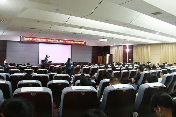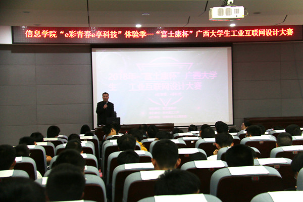 10月12日下午,2018年“富士康杯”广西大学生工业电子设计大赛在雁山校区01501报告厅正式开幕,本次开幕式到场嘉宾有富士康科技集团(南宁)生产主管谢炳堂先生、研发主管吕凤天先生、人资办主管陈强先生和李金川女士;信息科学与工程学院副院长陈超泉老师、学院党委副书记刘志丽老师和各年级辅导员老师。