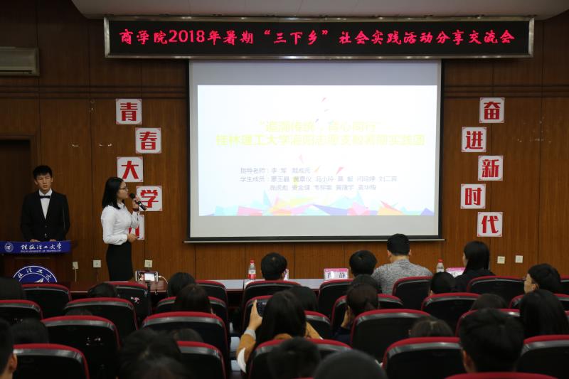 为展示商学院2018年暑期“三下乡”社会实践活动成果,激发同学参与社会实践活动的积极性,商学院于10月12日晚在屏风校区9501教室、10月16日晚在雁山校区05307教室举行了2018年暑期“三下乡——实践归来话成长,我们的青春故事”社会实践活动分享交流会。商学院各年级辅导及各兄弟学院社会实践部部长出席本次交流分享会,近400名同学参加本次分享会。