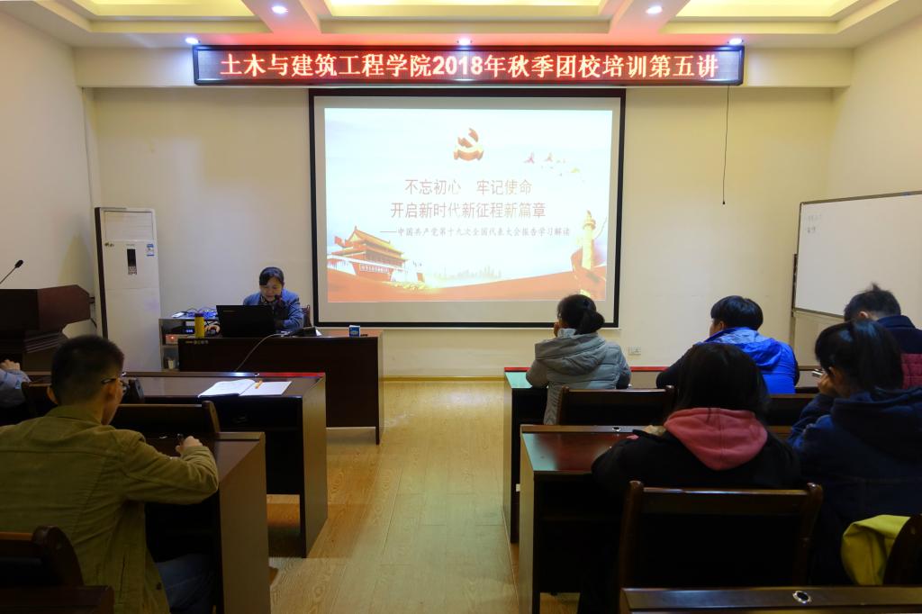 为深入学习贯彻习近平新时代中国特色社会主义思想、党的十九大精神和相关重要文献,土木与建筑工程学院于11月20日晚19:30在屏风校区4024会议室开展了2018年秋季团校培训第五讲。学院党委书记熊英老师、团委书记姚慧老师出席了本次培训,此次培训由学院党委熊英书记主讲。