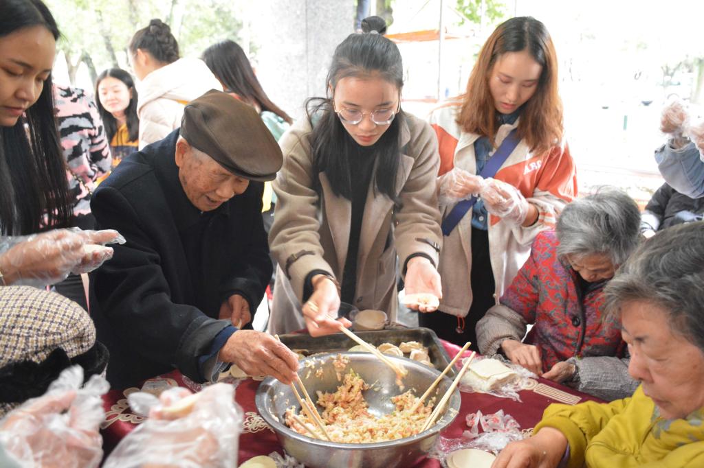 初冬时节,冷风飕飕,但志愿者们用温暖的行动驱散了这股寒意。一走进敬老院,志愿者们便发扬不怕苦、不怕累的精神,有的志愿者开始扫地、整理床铺、抹玻璃等等,帮助老人打造一个干净整洁的生活环境;随后,志愿者和老人们开展联谊活动——包饺子,志愿者们一边包饺子一边为老人表演精心准备的朗诵《中国话》、歌曲《我的中国心》等节目,现场其乐融融,欢声笑语不断,洋溢着温馨祥和的气氛。