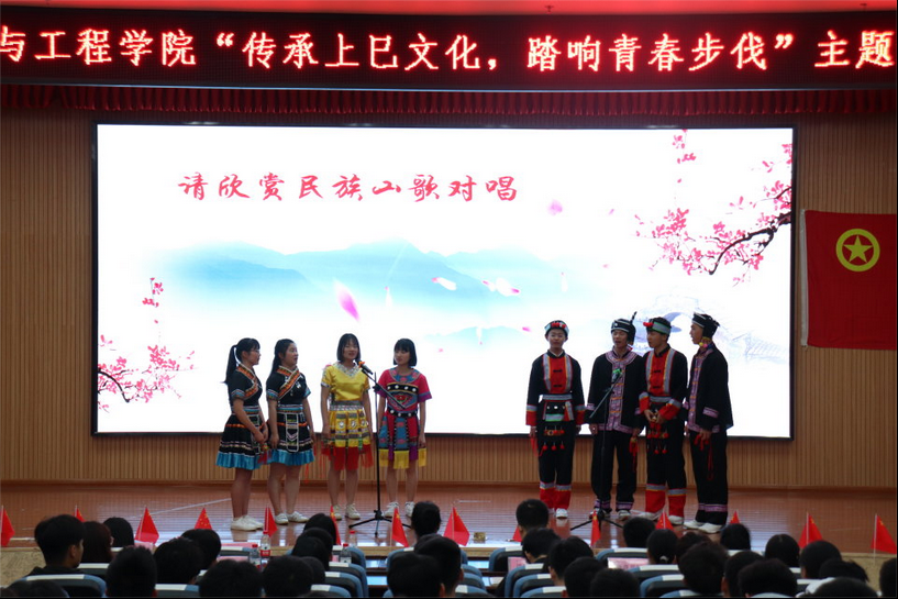 活动在主持人介绍“三月三”起源中拉开了序幕。通过观看短片,同学们进一步了解到了更多关于“三月三”的文化起源和发展;短片过后是精彩的竹竿舞,表演者们跳动的身姿表现出了当代新青年的青春与活力。舞蹈过后紧接而来的山歌对唱让同学们拍手叫好,对民族文化更添了几份自豪感。山歌结束之际,表演者还将象征着吉祥的绣球赠与观看的同学们。
