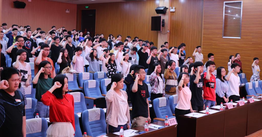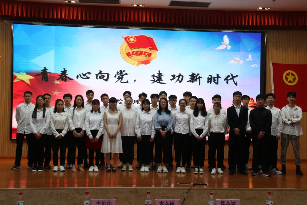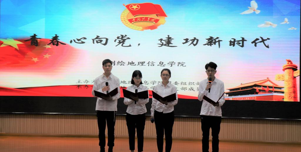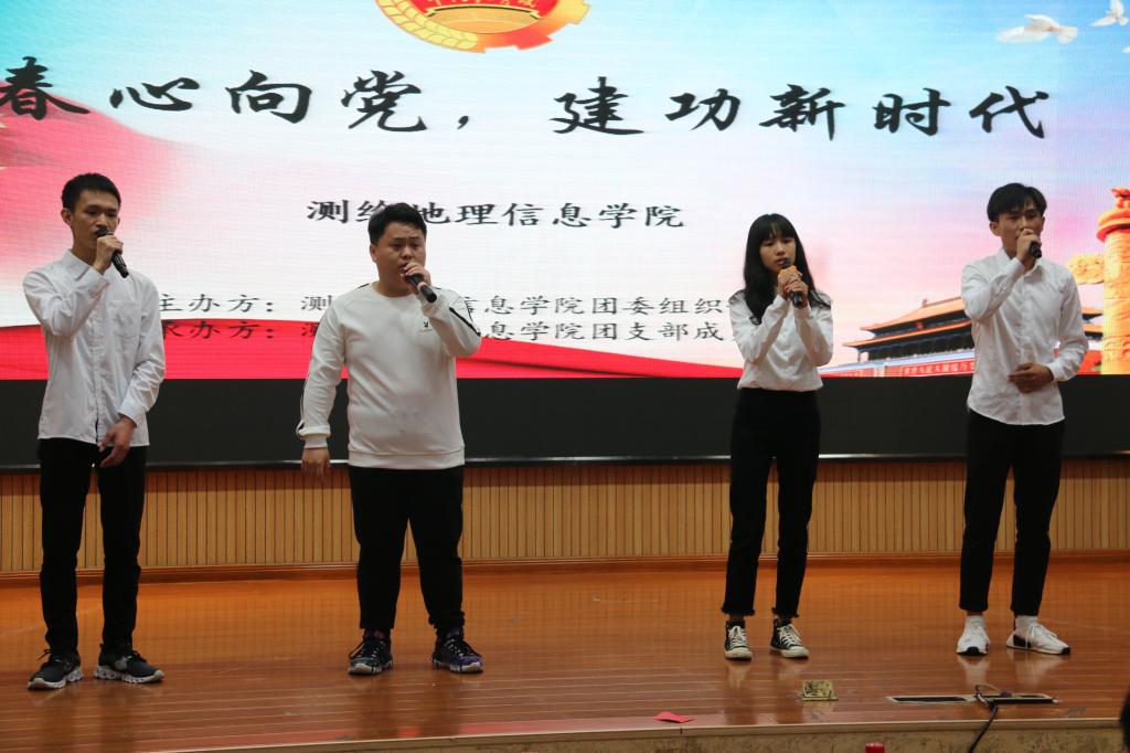本次活动在激奋人心的共青团团歌中拉开帷幕。首先,由王子恒、黄美琪等同学带来诗歌朗诵《青春中国》,字字铿锵有力,句句激情昂扬,同学们以热血为色,描绘了一个青春的中国。接着,为检验广大学子在“青年大学习”中的学习成果,现场进行提问互动环节,同学们热情高涨、积极抢答,充分展现了测绘学院学子的优良学风。随后,通过演唱歌曲《强国一代有我在》、话剧表演《可爱的中国》以及观看视频《我的信仰不平凡》,展现了老一辈革命家在中国共产党的领导下不畏牺牲、英勇拼搏的革命精神。之后,在主持人的带领下,全体学生重温了庄重的入团誓词。最后,李会娟老师做总结发言,她指出:党旗所指就是团旗所在,广大青年要更紧密的团结在以习近平同志为核心的党中央周围,高举习近平新时代中国特色社会主义思想伟大旗帜,不忘初心,牢记使命,继续怀揣高涨的热情努力奋斗。