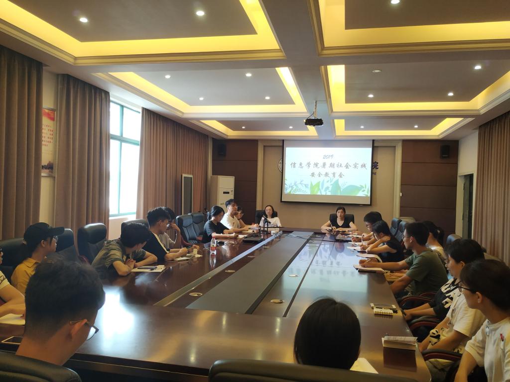 7月4日下午16点,信息学院组织的2019年暑期社会实践安全教育会在02507会议室举行。出席本次会议的有学院团委书记蒋琼老师、辅导员李雪君、李宗幸和蒙玲娟老师,学院团委科实部成员,以及2017级、2018级参加暑期实践活动的同学们。