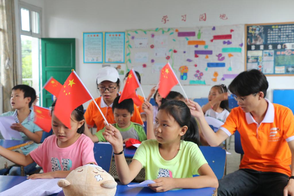 实践队员与小朋友一起挥旗歌唱《我和我的祖国》