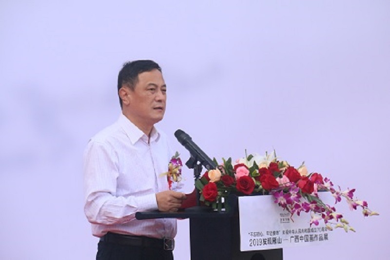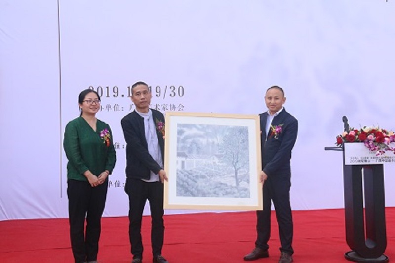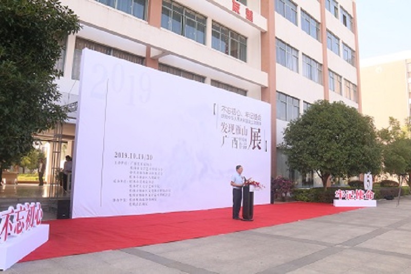 学校副厅级调研员张劲松致欢迎辞,对出席开幕会的领导嘉宾、艺术家和师生们表示热烈的欢迎,向关注和关心此次展览的社会各界表示衷心的感谢,并希望以此次展览为契机,不断提升我校艺术学科的办学水平和创作水平,使我们的学科建设再上新的台阶,希望能够搭建桂林乃至全区、全国各高校之间艺术交流和互动平台,团结和凝聚社会各界的力量,共同推动艺术教育事业的不断发展和壮大。雁山区委常委、宣传部部长、副区长李红致辞,希望在区域优势、教育优势的基础上创造出更多符合新时代精神的,优质的艺术作品。广西美术家协会常务副主席、秘书长陈毅刚发表了讲话,对雁山区美术事业发展给予高度评价并对艺术创作提出了新的要求,同时向我校艺术学院美术馆并捐赠了作品。最后,雁山区政协主席莫连旺宣布作品展开幕。