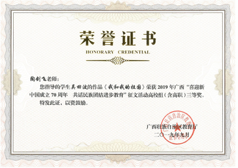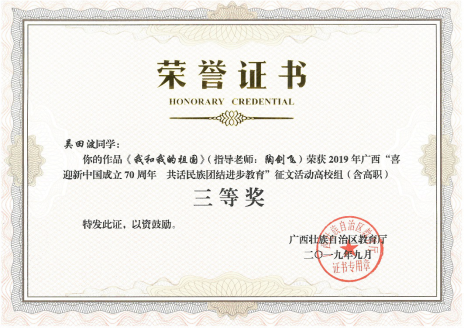 日前,广西壮族自治区教育厅开展的“喜迎新中国成立 70 周年 共话民族团结进步教育”征文活动已顺利结束,经过专家评审、教育厅审核,获奖名单已公布。地球科学学院地质学17-1班吴田波同学参赛作品《我和我的祖国》喜获三等奖,作品由陶剑飞老师指导完成。