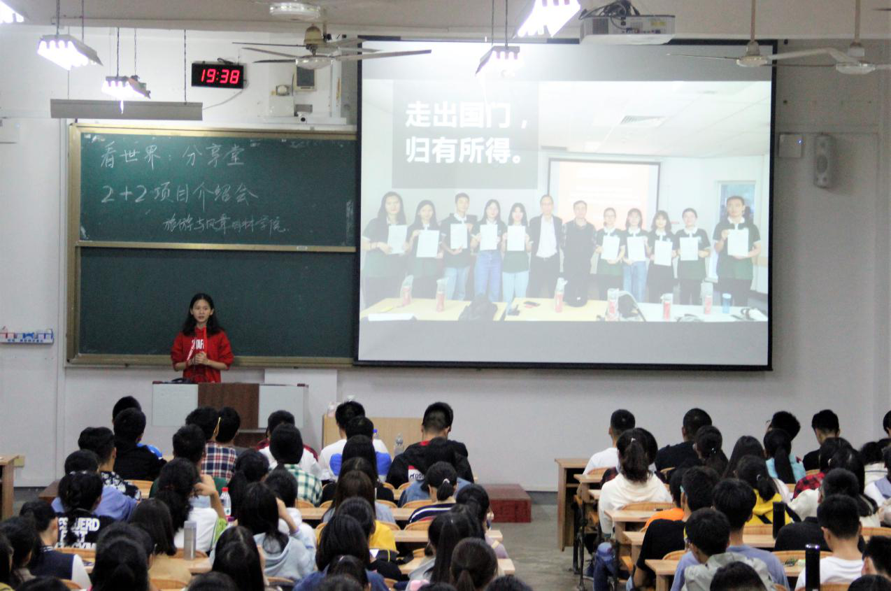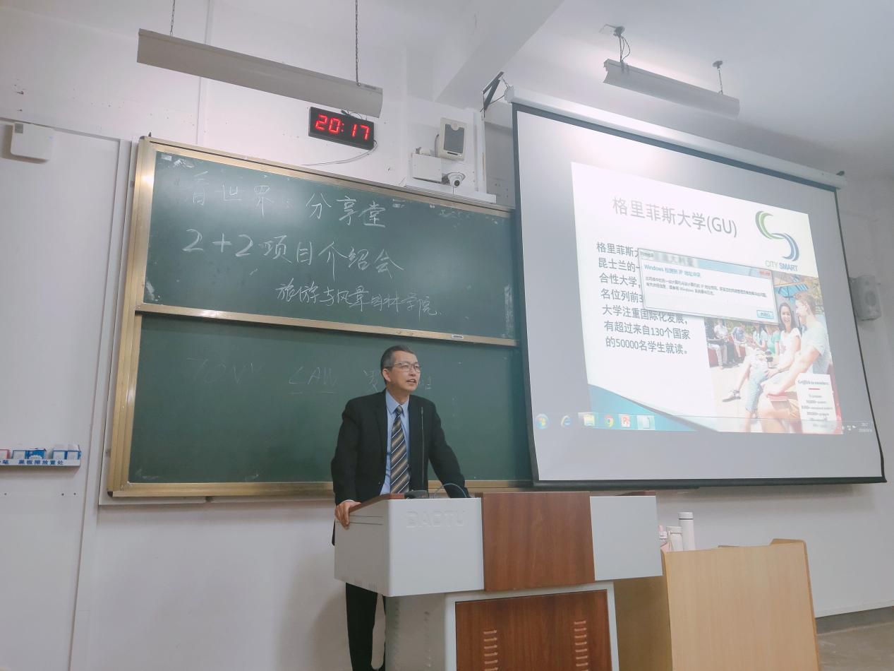 会上,城骏教育的罗启明先生对“2+2”合作项目进行了详细的介绍。罗先生从项目申请的要求、渠道和方式等方面给学生做了介绍。