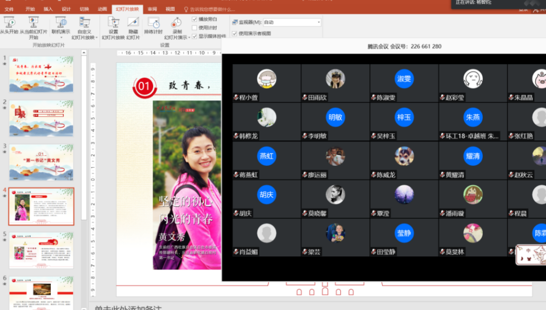 环境学院5月9日-5月16日期间组织开展了“致青春,为家国”—争做黄文秀式好青年主题团日活动。为切实开展好本次团日活动,许多团支部采用钉钉线上与QQ群聊的形式开展团日活动,也有部分团支部采取线下开展团日活动的形式,积极学习黄文秀书记相关事迹与精神。