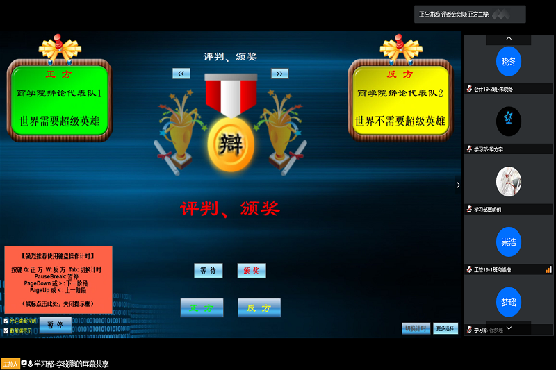 比赛伊始,双方辩手就“世界需不需要超级英雄”这一辩题展开激烈辩论。正方基于超级英雄的能力,认为超级英雄能够保障社会发展;反方则通过人对超级英雄的依赖性和超级英雄不可控的例子辩驳,认为超级英雄无法被约束,破坏人类社会原有秩序。在最精彩的自由辩论环节中,双方辩手交替发言,字字珠玑,妙语连珠。随后,在评委和观众提问环节,双方辩手针对所提的问题从自身论点出发一一作了回答。经过一番唇枪舌剑,反方代表队获胜,反方三辩刘奎良为最佳辩手。至此,商学院2020年春季学期线上辩论赛圆满结束。