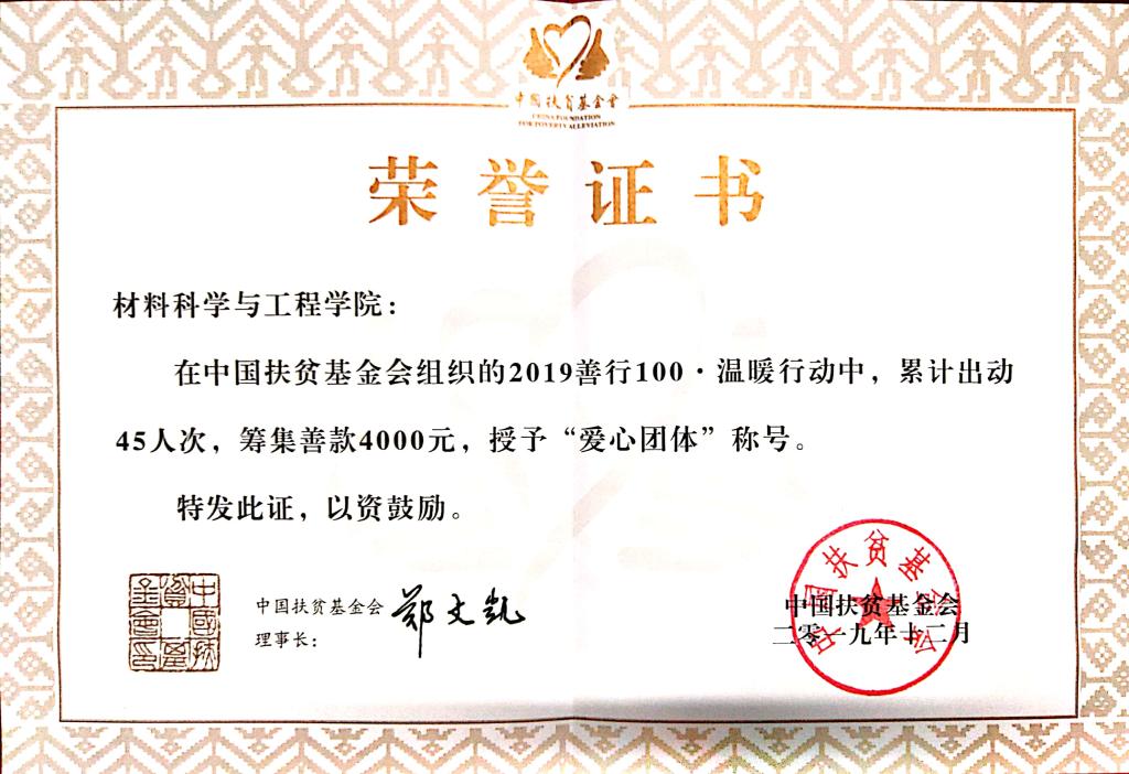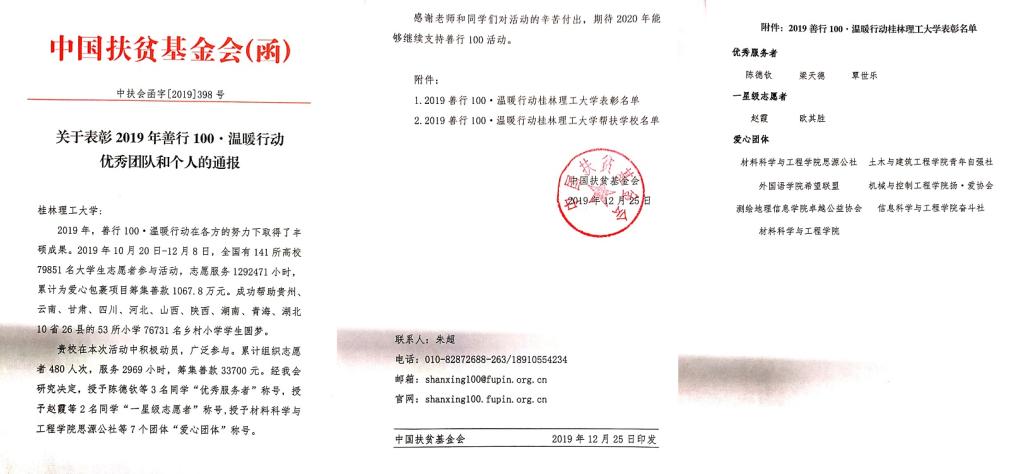 近日,中国扶贫基金会发来《关于表彰2019年善行100•温暖行动优秀团队和个人的通报》,材料科学与工程学院陈德钦、梁天德和覃世乐三人被授予“优秀服务者”称号,学院及院级社团被授予“爱心团体”称号。