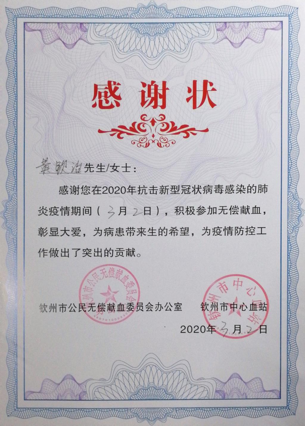 黄钦治获得的疫情期间无偿献血感谢状