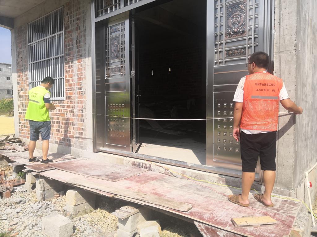 7月16日,进结镇高州村驻村第一书记王华金、工作队员冯侠到贫困户进行入户复核危房改造户面积。