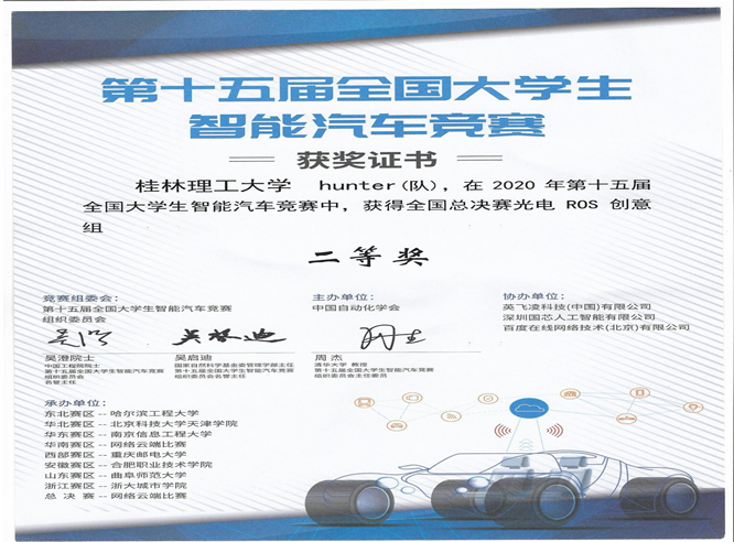 据悉,自第十五届全国大学生智能汽车竞赛组委会在7月4日公布了室外光电ROS预赛方案后,最终有效报名队伍数量达139支。经过线上选拔赛的比拼,最终四十支队伍进入第二轮线下比赛。我校机械与控制工程学院Hunter队(指导老师:梁勇,参赛队员:甘礼福、崔启、陈家彬、翟思敏、谢植送)是ROS创意组广西唯一入围全国总决赛参赛队伍。Hunter队各成员经过3周的全力备赛,与来自全国入围总决赛的40只队伍进行激烈比拼后,最终在全国总决赛中脱颖而出,获得佳绩。