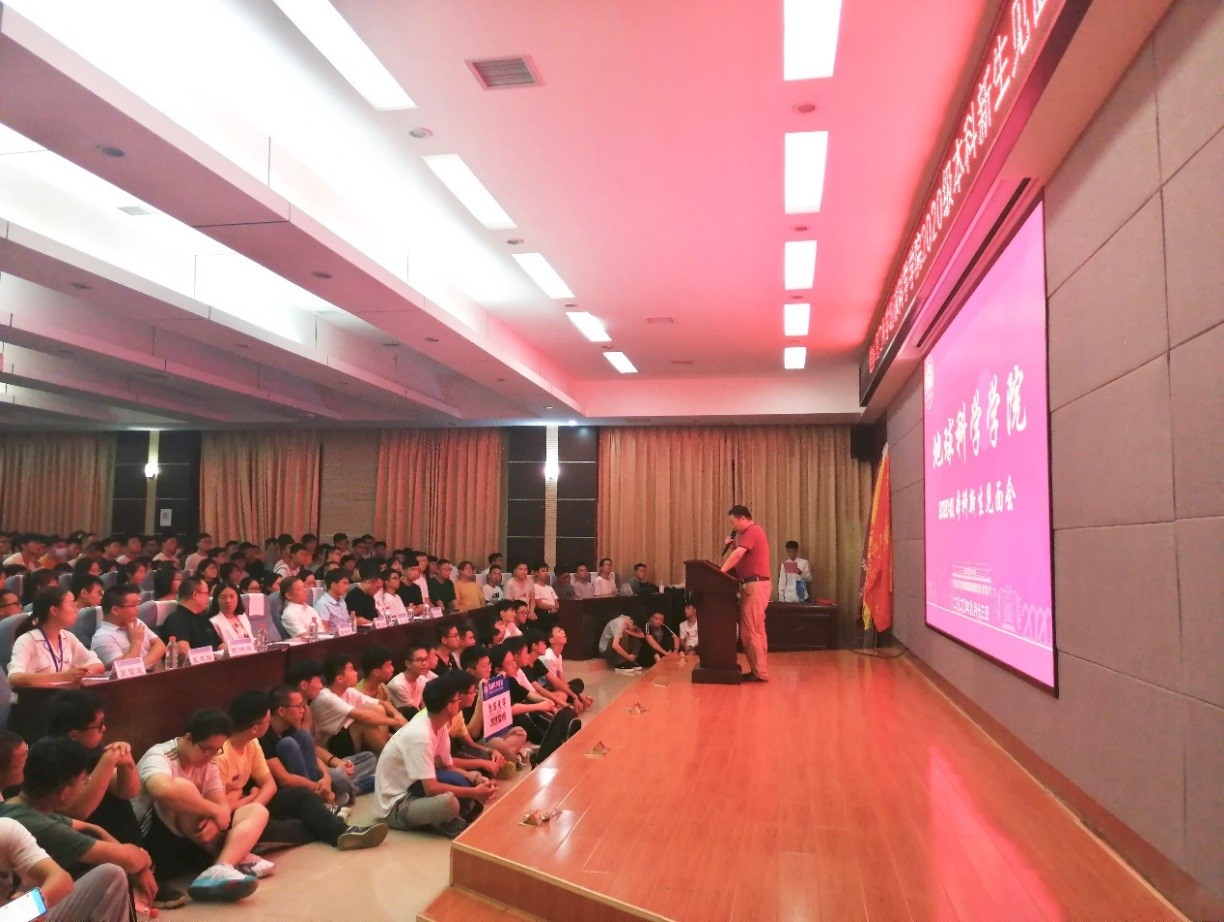 会议伊始,主持人介绍到会领导,全体师生奏唱国歌。会议第二项为学院党委书记曹文献致欢迎辞,曹书记在讲话中表示了他对全体新生的热烈欢迎与殷切期盼,希望新同学们能够适应大学生活,尽快融入地院这个大家庭。会议第三项为教师代表彭三曦老师,2018级学生代表许塬浩,2020级新生代表蒙权依次进行发言,他们为新同学们提供了宝贵的建议。会议第四项为学院常务副院长熊彬进行讲话,熊副院长对新同学们表示了热烈欢迎,介绍了本学院各专业特色与方向,并表达了对2020级新生们的高度期望,希望全体新生刻苦钻研,发扬地院精神。最后,曹书记和熊副院长为新生代表发放院徽和授旗,全体师生佩戴院徽,奏唱校歌,本次会议宣布结束。