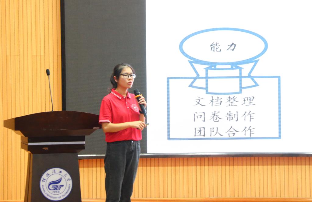 随后,“返家乡社会实践”团队代表甘志琴同学分享支教、助力经济发展的收获与感动;青春战“疫”走基层,桂工青年“普”篇章团队代表程蕾蓉同学讲述了参与这场疫情防控阻击战的亲身经历及收获;助力乡村脱贫攻坚调查团主讲人叶秀青同学分享了对于国家脱贫深入了解的心路历程;赴灌阳“兴文化教育,助少年成长”支教实践服务团主讲人王小娅同学讲述情系灌阳留守儿童,助力乡村少年梦想启航,争做青年担当;“第二课堂成绩单”精准就业研究团队主讲人林伟兰同学讲述药企实践实习的经历与对第二课堂深入的认识。最后在退役大学生征兵宣讲中,2019级李嘉兴同学从为什么参军入伍、军营生活两个方面进行了分享。