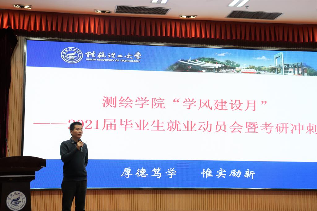 为进一步做好2021届毕业生就业工作,激发2021届毕业生就业积极性和考研积极性,10月22日晚,测绘地理信息学院于雁山校区图书馆报告厅举行了2021届毕业生就业动员会暨考研冲刺动员会。学院党委副书记周明权及全体学工办辅导员出席会议,优秀研究生代表刘启睿及全体2021届本科毕业生参加会议。会议由学院团委副书记陆琴老师主持。
