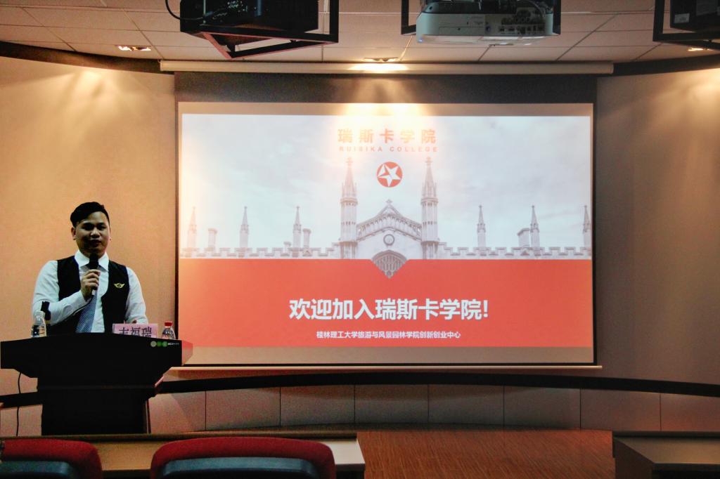 会议特别邀请到了旅游与风景园林学院2011级校友、中国青年创业导师韦福瑞来做经验分享。会上,韦福瑞向同学们介绍了瑞斯卡学院的历史、成就以及个人创新创业事迹,特别强调了创新创业对我们当代大学生的重要性以及各类科创类竞赛可以带给我们的成长,鼓励新生积极参与到创新创业类的活动中来,韦福瑞学长丰富的经验和阅历使参加本次讲座的同学们受益匪浅。