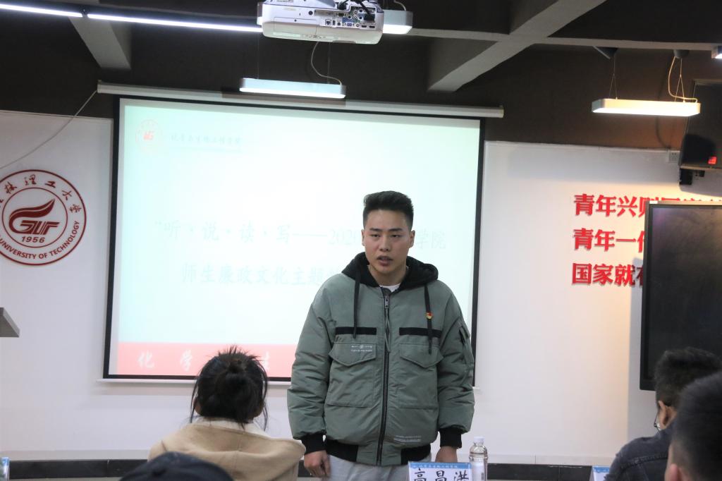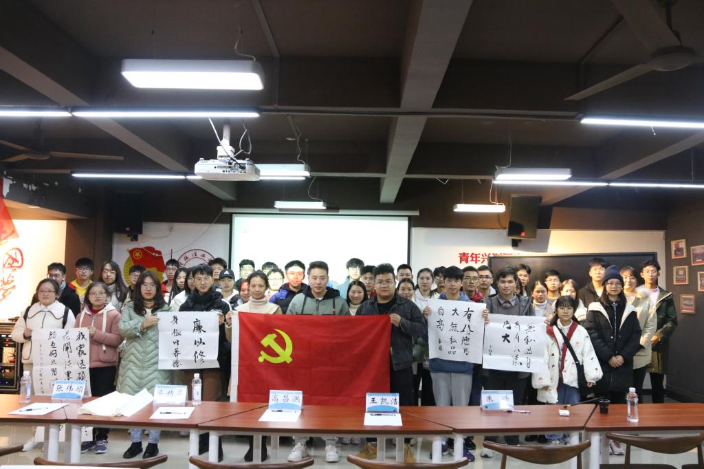 为深入贯彻落实党的十九届五中全会精神,进一步加强我院的党风廉政文化建设,促进营造风清气正良好政治环境,12月3日晚,化学与生物工程学院于雁山校区青马书屋开展“听·说·读·写——师生廉政文化主题教育及传统文化体验活动”,旨在大力弘扬廉洁文化,强化廉洁教育,营造崇廉尚廉、倡廉守廉的良好氛围。出席本次活动的嘉宾老师有学院纪委委员高昌洪老师、学院团委副书记王凯浩老师、各年级班主任以及各学生党支部书记、学院青马班学员共计60余人参加活动。并且学院教师党员和学生党员发挥模范带头作用,结合习近平总书记反腐倡廉的名言名句为素材,最终以书法作品的形式加以呈现。
