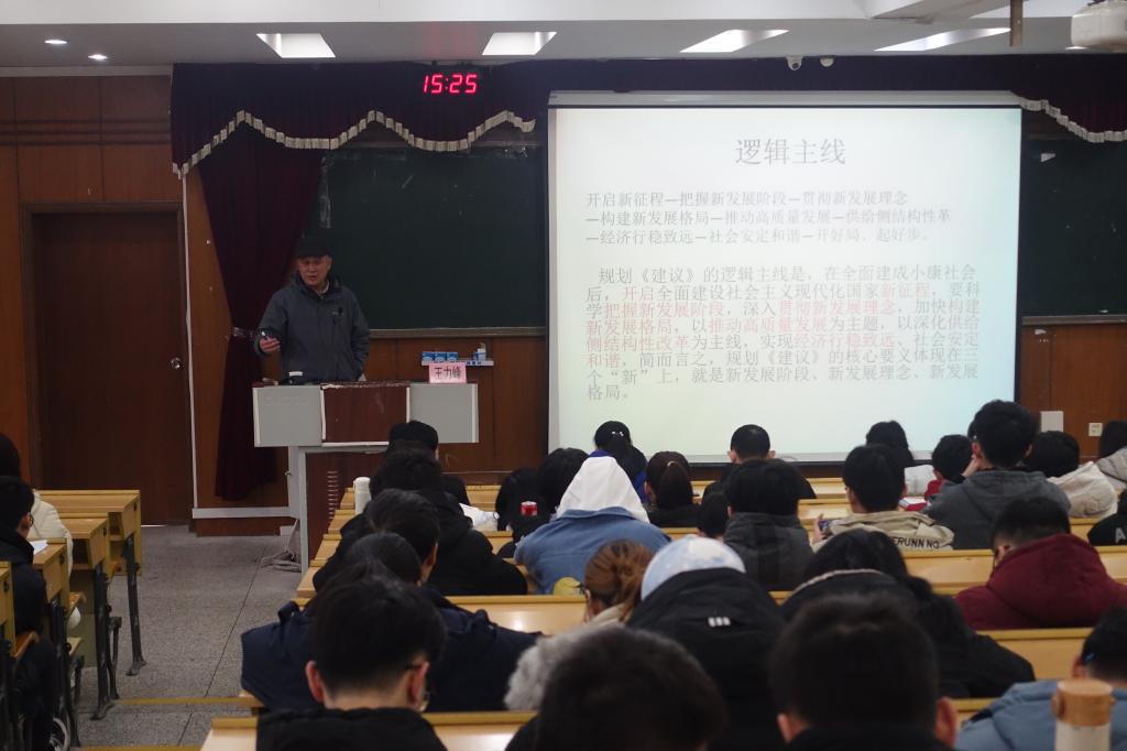 讲座开始,王力峰教授围绕“奋进新时代”向同学们宣讲了党的十九届五中全会精神。接着,王力峰教授从把握新时代发展方向、贯彻新发展理念、构建新发展格局、推动高质量发展等方面对“十四五”规划建议主线进行梳理。随后,王教授结合我国经济恢复情况,分析了国家供给侧结构性改革及社会经济发展形势。王教授还从“两个一百年”奋斗目标谈起,和师生们分享了党的发展历史、我国社会的主要矛盾、社会现今存在的问题、“十四五”规划展望以及国家未来发展目标等方面内容。