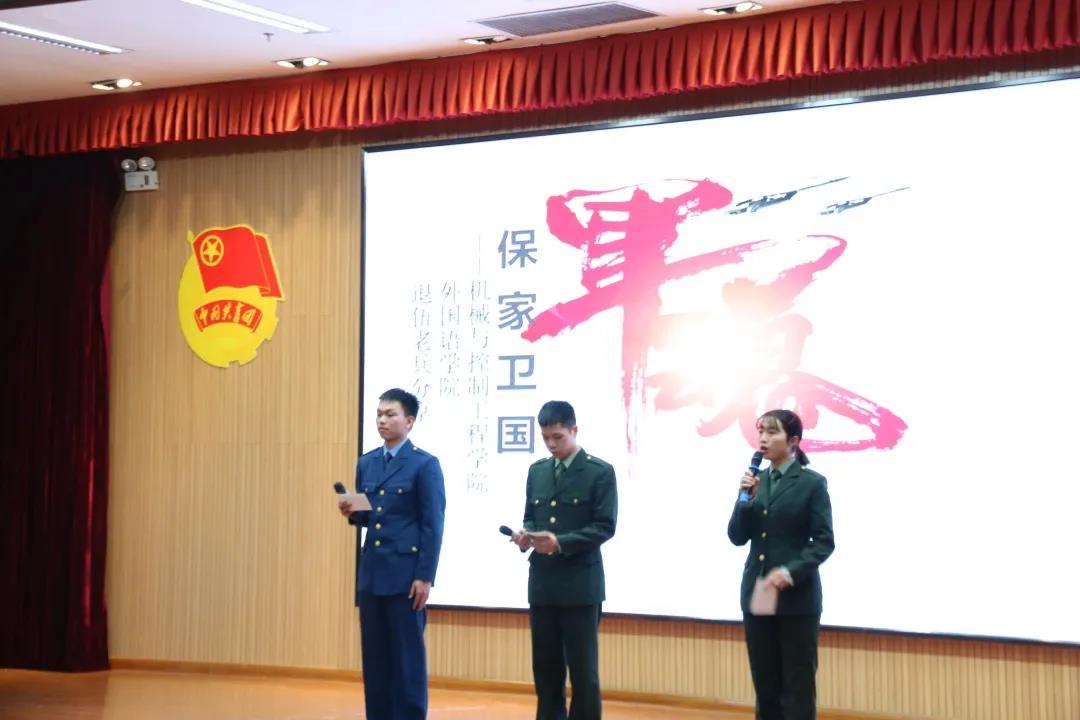 英语20-5班用一首《我和我的祖国》抒发了他们赤诚的爱国情意,神州奋起,国家富强;山河壮丽,岁月峥嵘;江山不老,祖国常春。机械类2020-2班的吉他弹唱《椿》歌颂了祖国永远年轻、充满活力,祝愿伟大的祖国永远繁荣昌盛。退伍老兵黄慧仙、张杰贵和潘泽宇上台为大家分享军旅故事。在部队的训练虽艰苦却充实,他们朴实的言语中展现出成为中国军人的骄傲与自豪,感染了在场的同学,让同学们对军旅生活产生向往之情。