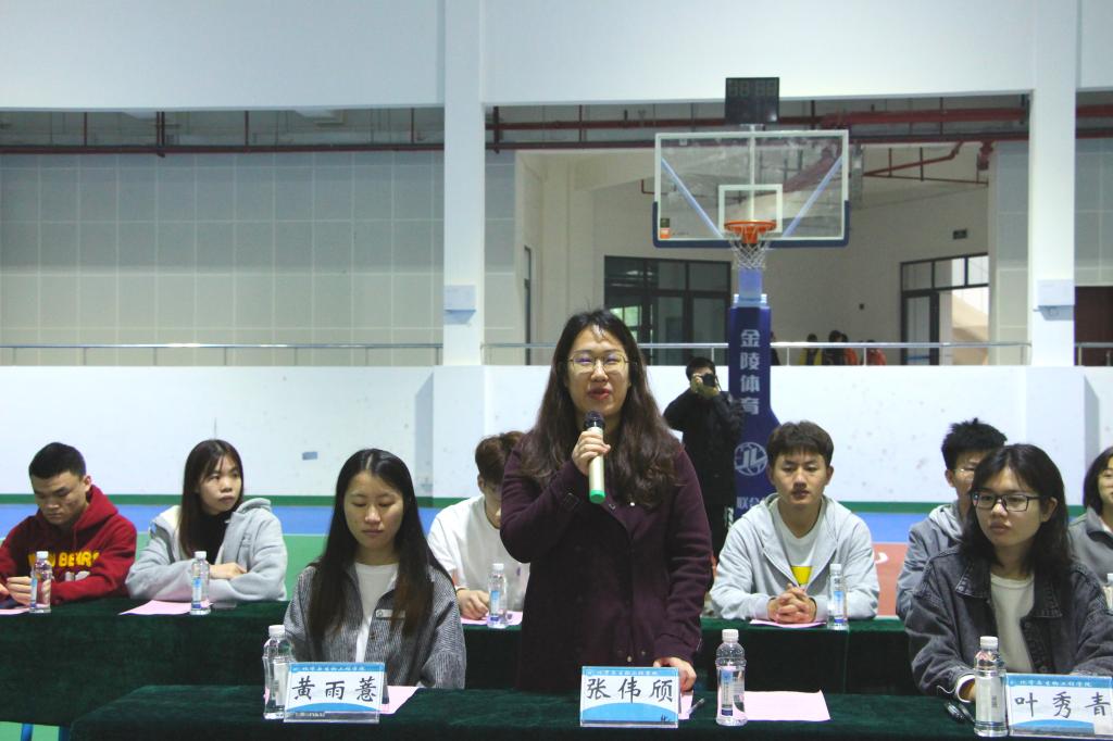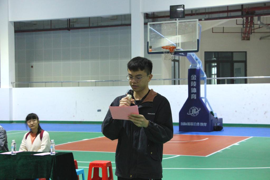 在比赛开幕式上,张伟颀老师表示希望各位球员们能够在篮球场上表现出团结奋斗,顽强拼搏,乐观向上,锐意进取的精神,紧接着球员代表和裁判代表发言。随后主持人宣布“化生杯”篮球赛正式开始。