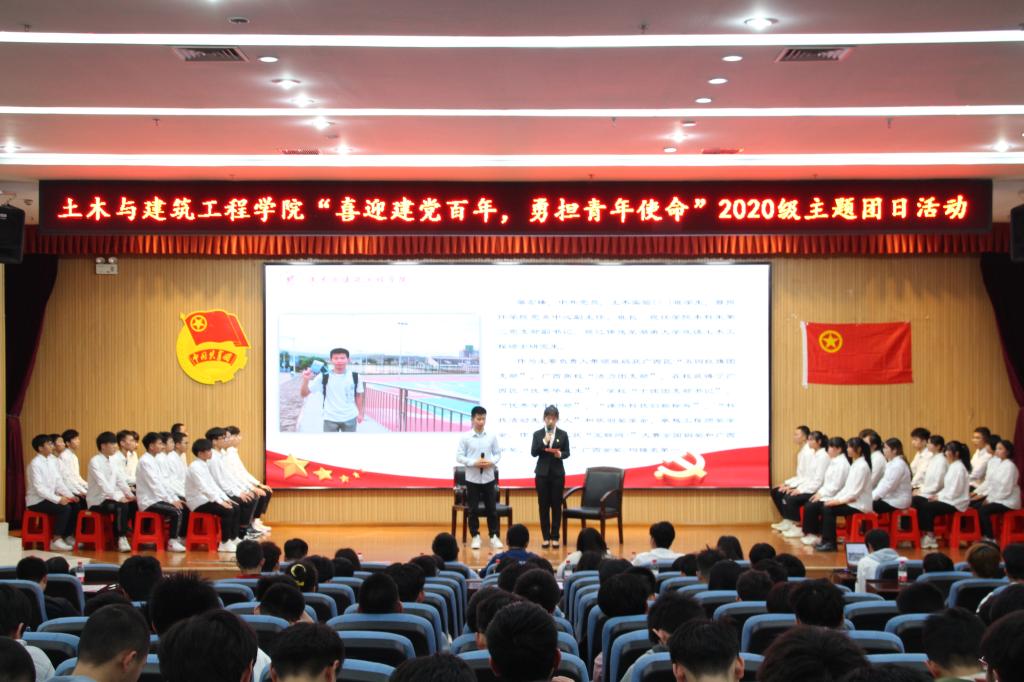 为学习中国共产党波澜壮阔的革命历史,重温革命精神,4月20日由土木与建筑工程学院土木类2020-1班团支部和土木类2020-4班团支部承办的“喜迎建党百年,勇担青年使命”主题大型团日活动在雁山校区图书馆报告厅举行,土木与建筑工程学院团委副书记安邦国老师、2020级辅导员谢基柱老师、唐子晴老师及同学代表参加了本次活动。