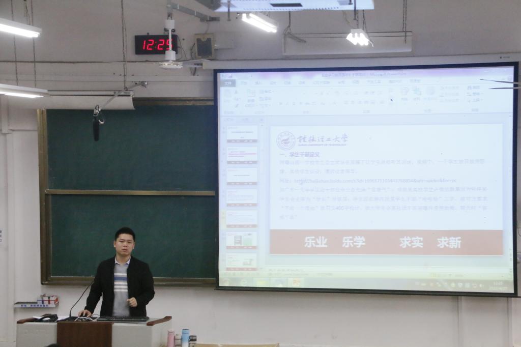 4月27日中午,理学院在雁山校区07318教室举办2021年春季学期党史学习教育暨学生骨干培训班,学院团委、学生会、研究生会、2019-2020级班长、团支书120余人参加培训会,培训由学院团委副书记舒强老师主持。
